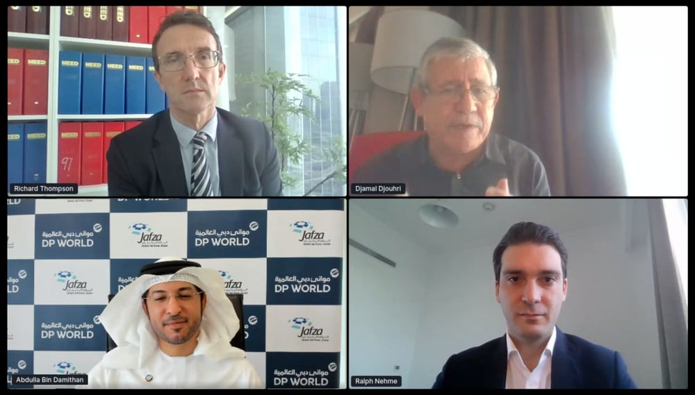 وشارك في الجلسة الحوارية للندوة كل من عبدالله بن دميثان، المدير التنفيذي للشؤون التجارية بموانئ دبي العالمية – إقليم الإمارات، وجمال جوهري، الرئيس التنفيذي لشركة الغرير للموارد لتجارة الزيوت والبروتينات، ورالف نيهم، كبير مديري شركة أيروفارمز،. وأدار جلسة الحوار ريتشارد طومسون، مدير التحرير في مجلة )ميد(.
