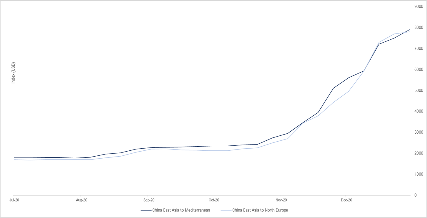 On the supply-side, traders have faced rising costs as a direct result of operational constraints imposed on supply chains from uncertain and inconsistent activity. For some major, historically established shipping routes, such as those linking Europe with production centers across Asia, there has been an unprecedented spike in container freight rates. Costs have recently jumped by as much as 600% (see figure 1) as short-term stocks of containers have been unable to respond to sporadic pick-ups in demand for cargo movement after a months’-long slowdown.