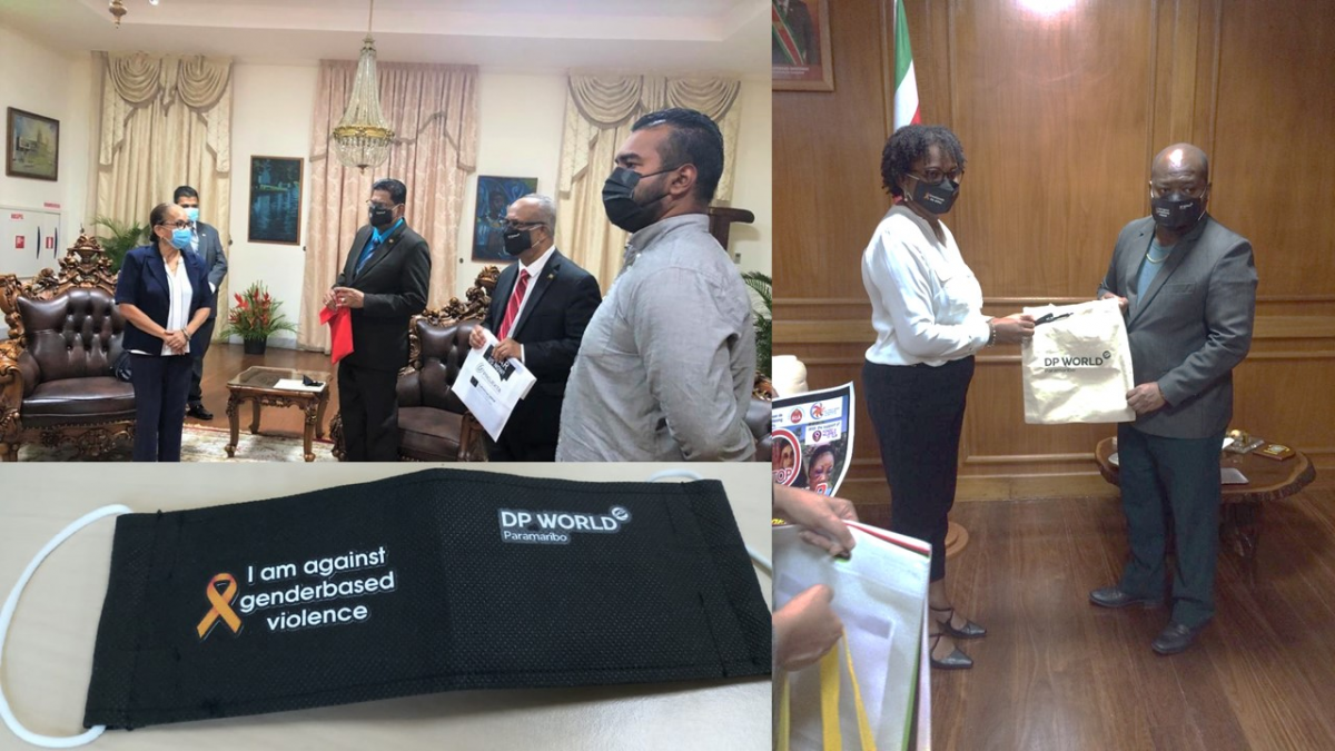 In solidarity with the Surinamese women's movements, DP World Paramaribo choose to make the statement by sponsoring printed face masks which stand against any form of violence. On Monday, November 23, the masks with the statements "Break the silence!" and “I am against gender-based violence” presented to President Chandrikapersad Santokhi, Mr. Humphrey Dundas as the representative of Vice President Ronnie Brunswijk and the Chairman Marinus Bee of the national assembly, together with representatives of Foundation Ilse Henar- Hiwit. By means of this action, the organization is demanding attention from the government to tackle this problem.