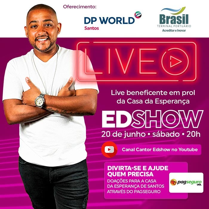 DP World Santos and Brasil Terminal Portuário, two of the largest port operators in the Port of Santos, are uniting again for a social action. This Saturday, 20th, at 8 p.m., they promote a live show with singer Edshow, on his Youtube channel.