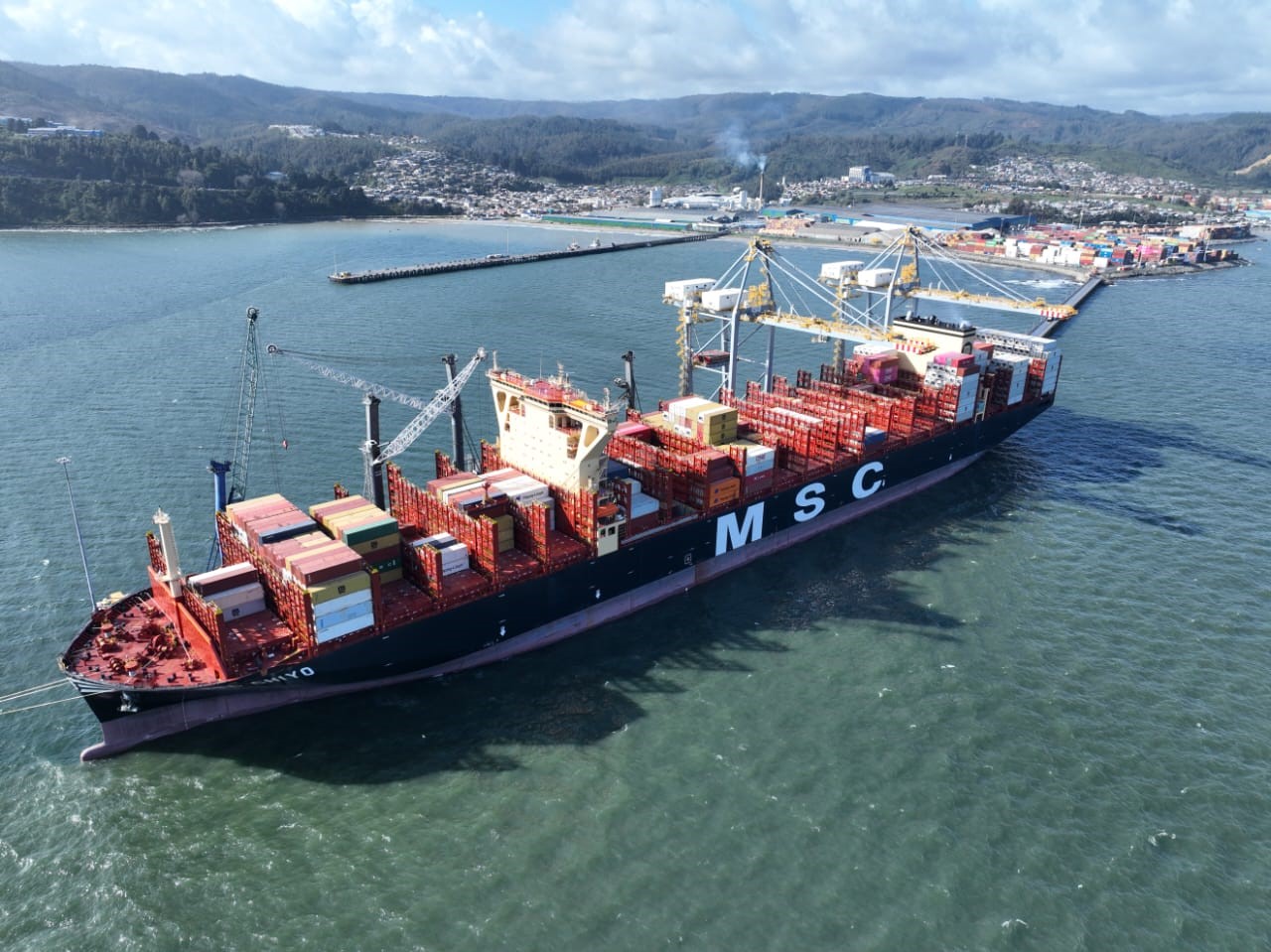 Con su eslora de 366 metros y su manga de 51 metros, el portacontenedores MSC Chiyo recaló en el terminal de DP World Lirquén, en la Región del Biobío.