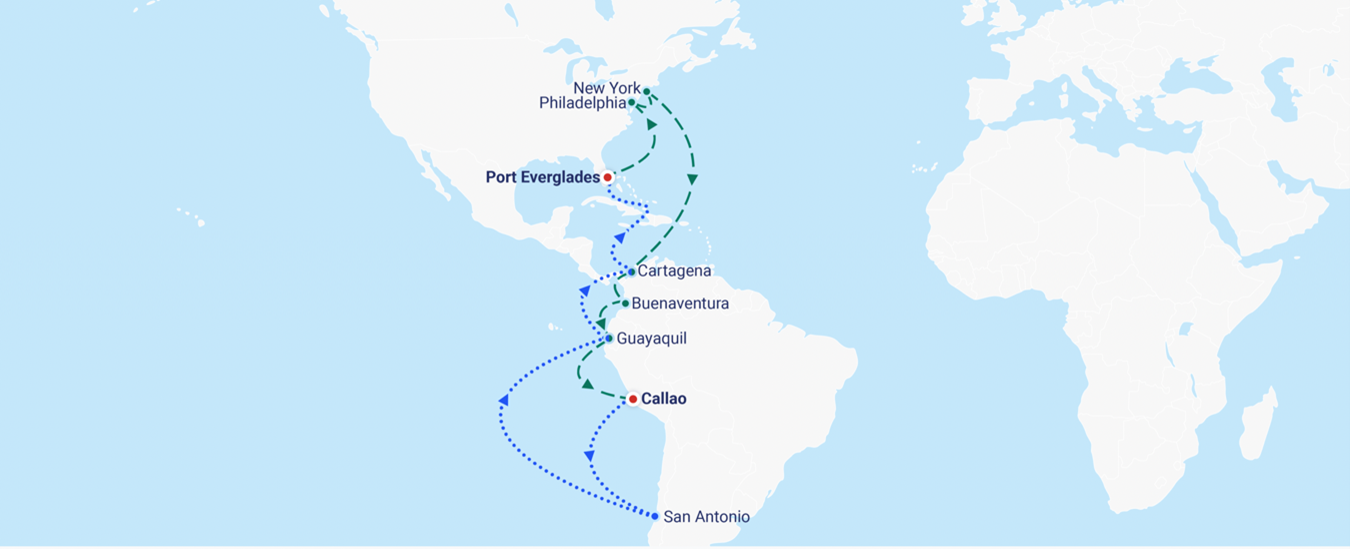 El Américas XL es un servicio intra-américas que tiene un ciclo de 42 días y que incluye visitas en Port Everglades, Filadelfia, Nueva York, Kingston, Buenaventura, Callao, San Antonio, Guayaquil, Cartagena y nuevamente Port Everglades como se muestra en la siguiente imagen:
