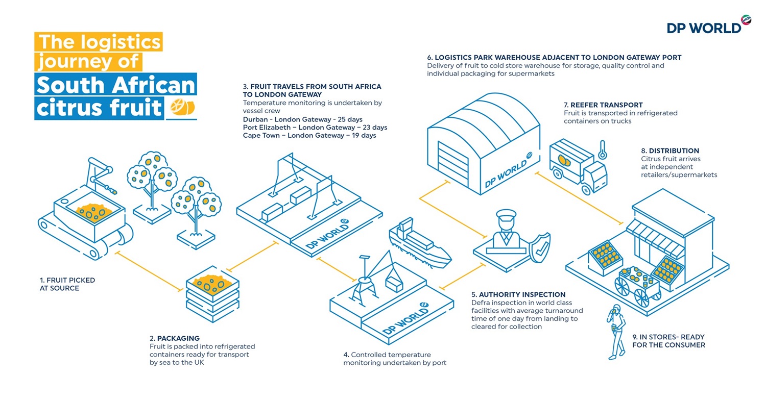 Like many other products, citrus fruit embarks on a long journey before they reach the consumer kitchen. Speed and freshness are key. Over the coming months we will share details of the typical logistics journey the citrus fruit takes from farming to supermarket. Keep watching this page for further details and information on how DP World London Gateway plays a vital part in this industry.