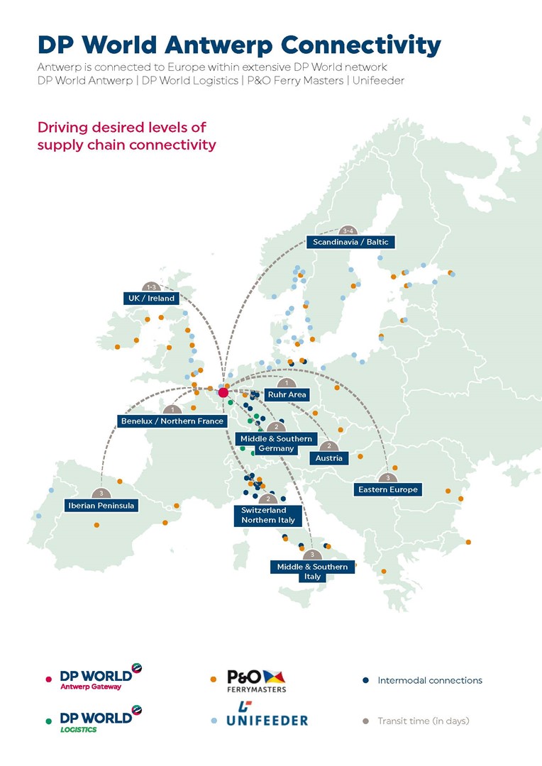 Onder de intussen flink gegroeide paraplu van DP World in Europa vallen de DP World diepzee en inland terminals, P&O Ferry Masters (door-to-door intermodale specialist) en Unifeeder (short sea verbindingen). Leg alle modaliteiten bij elkaar en combineer dit met de uitgebreide railverbindingen van de groep, en je krijgt een enorm netwerk dat de terminal van Antwerp Gateway verbindt met alle grote logistieke regio’s in Europa. Voordelen van het netwerk zijn de snelle en betrouwbare transittijden, de hoge frequentie en de duurzaamheid van deze intermodale en shortsea oplossingen. Antwerpen fungeert als single point of entry.