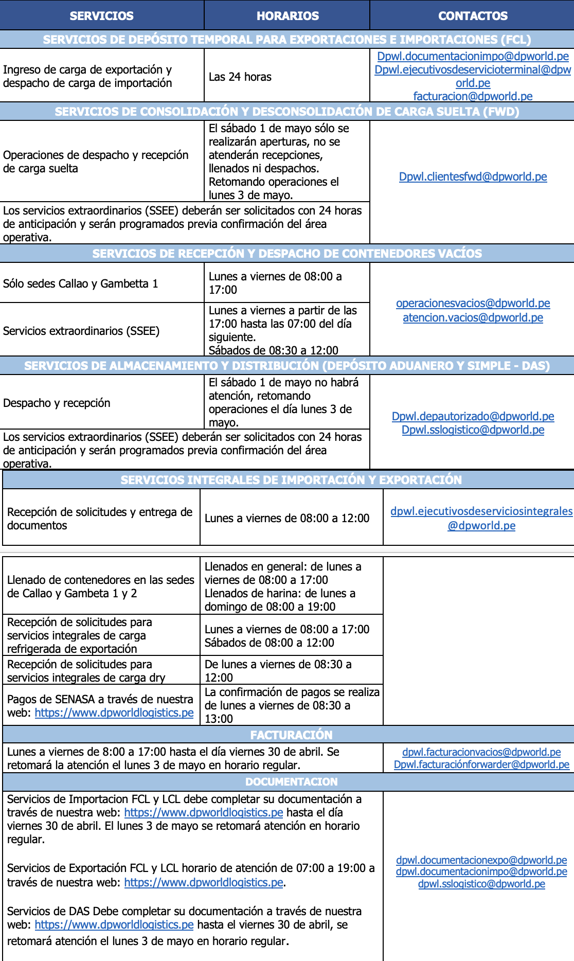 HORARIOS DE ATENCIÓN SÁBADO 01 DE MAYO