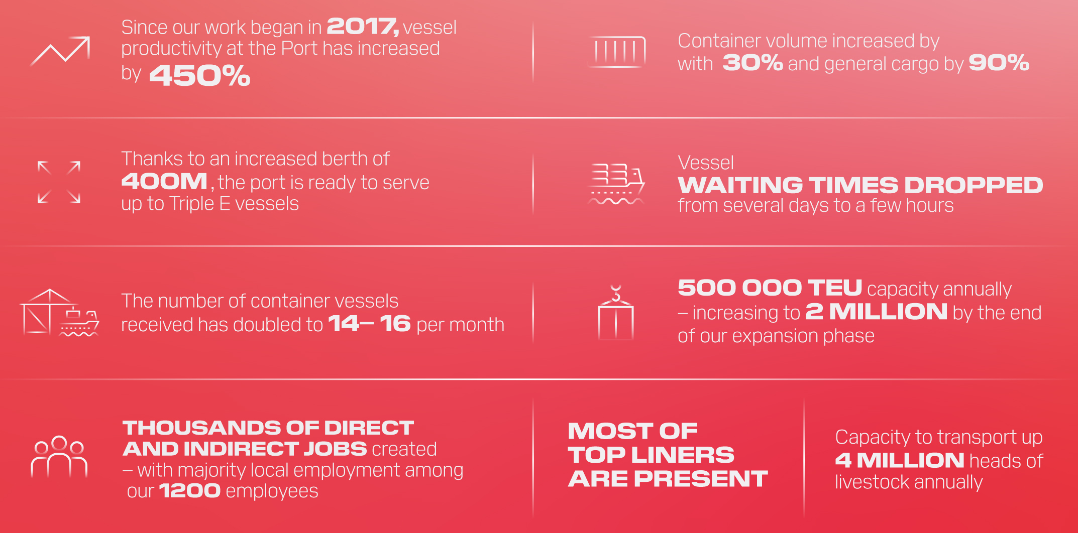 In addition to the 650 metres of linear wharf, DP World Berbera completed an additional 400 metre quayside and additional 250,000 square meters of port yard, thus increasing the capacity of the port to 450,000 TEUs.