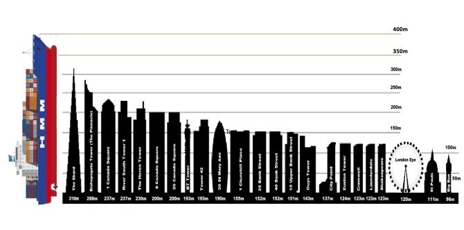 A new class of container ship, at 399.9m, HMM Oslo is longer than The Shard is tall. She is 61.5m wide and has a capacity of 23,820 TEU (twenty-foot equivalent units).