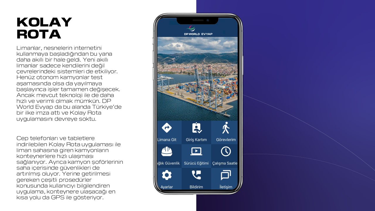 Cep telefonları ve tabletlere indirilebilen Kolay Rota uygulaması ile liman sahasına giren kamyonların konteynerlere hızlı ulaşması sağlanıyor. Ayrıca kamyon şoförlerinin saha içerisinde güvenlikleri de artırılmış oluyor. Yerine getirilmesi gereken çeşitli prosedürler konusunda kullanıcıyı bilgilendiren uygulama, konteynere ulaşacağı en kısa yolu da GPS ile gösteriyor.