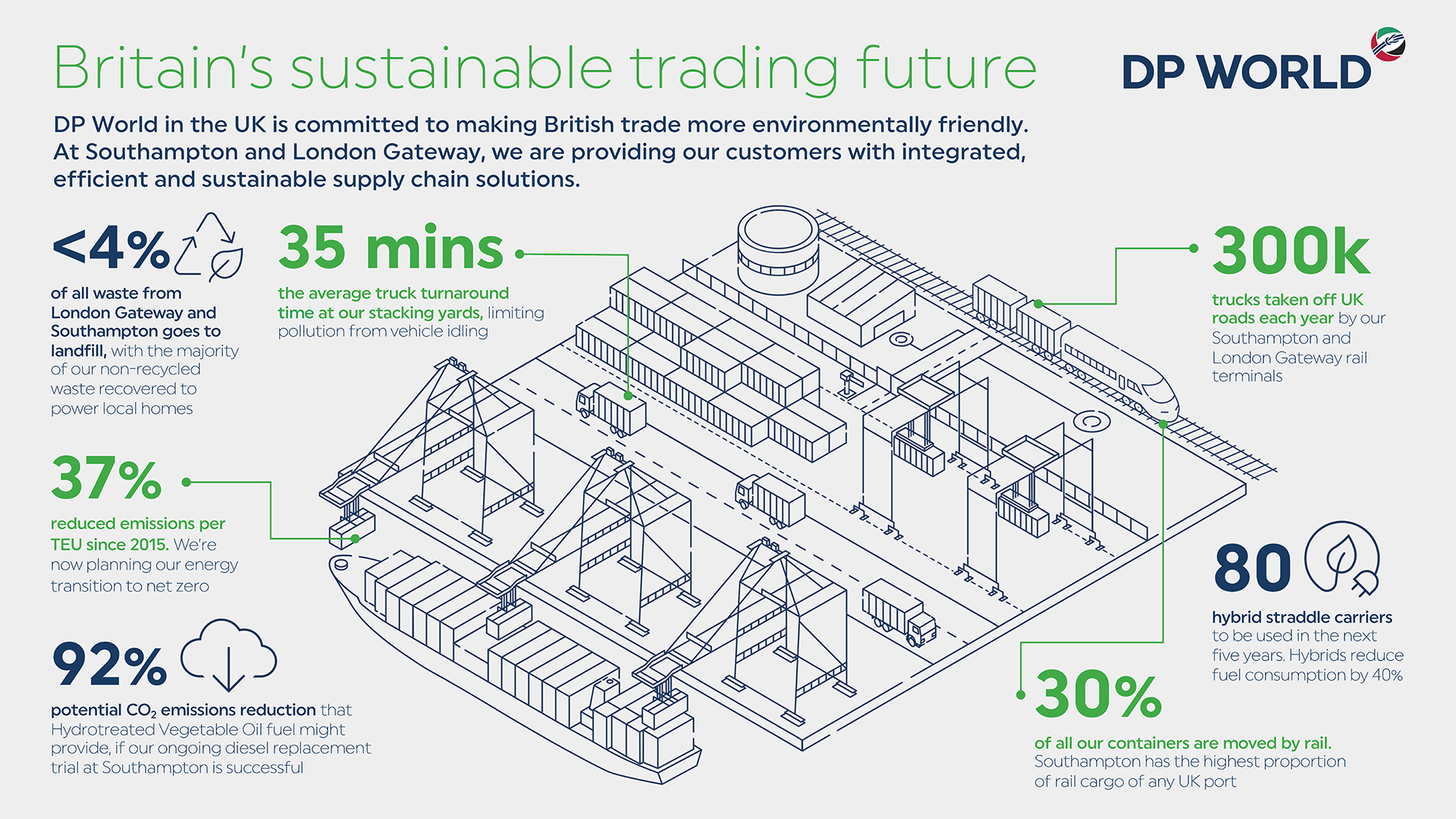 To support Southampton city’s vision is to create a cleaner, green, healthier and more sustainable city, DP World is the first port in the UK to introduce a ‘green’ charge on older trucks to pick up or drop off a container. It is part of a number of measures the company is taking to help cut emissions.